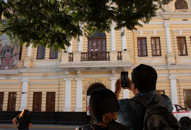 El sábado 10 de mayo de 2025, la misma plaza hervía de vida: más de ocho mil personas agradecieron a Dios el pontificado de León XIV. «Papa, amigo, Chiclayo está contigo», a un solo pulmón. Semanas después, aún cuelgan los carteles de «Bienvenidos a Chiclayo, la ciudad del papa», y parece que seguirá así una buena temporada. No es raro ver su foto en las fachadas de los edificios públicos, de casas particulares o en restaurantes. Un par de ellos se autoproclaman «el favorito del papa». Prevost pasó aquí ocho años de obispo, con una intensa labor pastoral. Hubo euforia tras el «Habemus papam». Tanta que han instalado una efigie de cartón de tamaño natural en el balcón de la Municipalidad, como un San Pedro criollo.