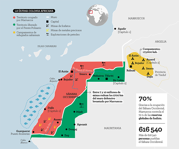 A la espera de que las partes se reúnan, nada parece haber cambiado sobre el terreno. Diferendo, contencioso, disputa, controversia… Estos tecnicismos intentan levantar acta de la realidad, pero solo la palabra guerra araña el drama que se vive en el Sáhara Occidental desde hace ya medio siglo. La represión en los territorios que Marruecos ocupó por la fuerza (teñidos de rojo sobre el mapa); la lucha por la causa en la porción de desierto que, al otro lado del muro, gobierna el Frente Polisario (en verde); las penurias en los campamentos donde se refugian más de 170 000 personas (en dorado).