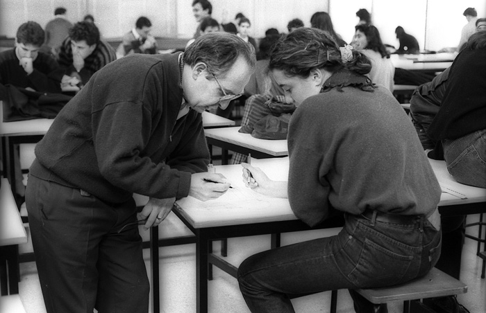 Lo primero que hice fue marcharme con César Ortiz-Echagüe a visitar escuelas a Múnich, Zúrich y Stuttgart. Repartimos trabajos: Rafa Echaide [profesor de la Escuela hasta 1994] estuvo en Suecia y Jaime López de Asiáin en Estados Unidos. El viaje duró siete o diez días, lo justo para ir recorriendo sitios, hablando con profesores, ver cómo funcionaban las escuelas e informarles de lo que queríamos hacer aquí. En Europa, un centro no estatal en el régimen de Franco se veía como una cosa muy buena.